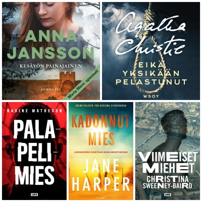 Kesäkuussa lukemani arvostelukappaleet olivat huhtikuussa ilmestyneitä kirjoja. Nadine Mathesonin Palapelimies on trilleri, jossa jahdataan Lontoossa riehuvaa paloittelumurhaajaa. Jane Harperin Kadonnut mies on dekkari kolmesta veljeksestä Australian takamailla, nyt yksi veljeksistä on joukosta pois ja toinen veljeksistä alkaa tutkia hänen kuolemaansa. Christina Sweeney-Bairdin Viimeiset miehet on lähitulevaisuuteen sijoittuva dystopia, jossa flunssan kaltainen tauti tappaa ainoastaan miehiä.